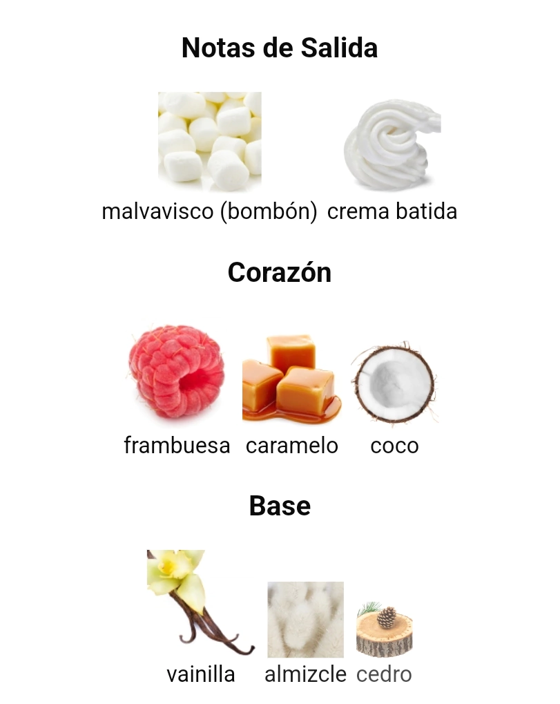 Las Notas de Salida son malvavisco (bombón) y crema batida; las Notas de Corazón son frambuesa, caramelo y coco; las Notas de Fondo son vainilla, almizcle y cedro.