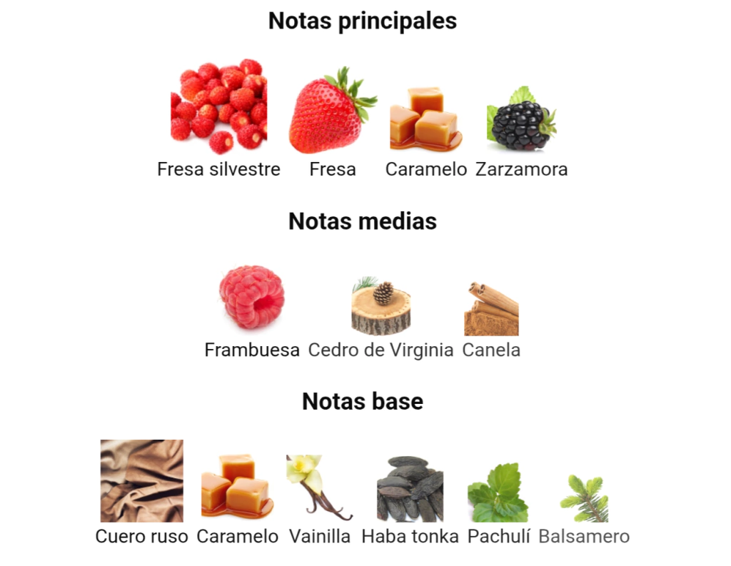 Las notas de salida son fresa silvestre, fresa, caramelo y zarzamora; las notas de corazón son frambuesa, cedro de Virginia y canela; las notas de fondo son cuero ruso, caramelo, vainilla, haba tonka, pachulí y abeto balsámico.